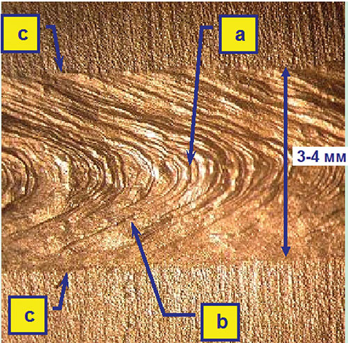 Поверхность лазерных сварных швов исследовалась в граничной зоне шва «с», центральной зоне «a» и промежуточных «b» (рис. 3 а). Если ширина шва была меньше 4 мм, промежуточная зона была исключена из рассмотрения и исследовались только граница и центр таких сварных швов.