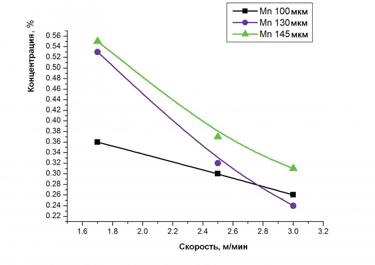 Рис. 4. Распределение концентрации марганца в приповерхностном слое шва в центральной части от скорости перемещения луча лазера.
