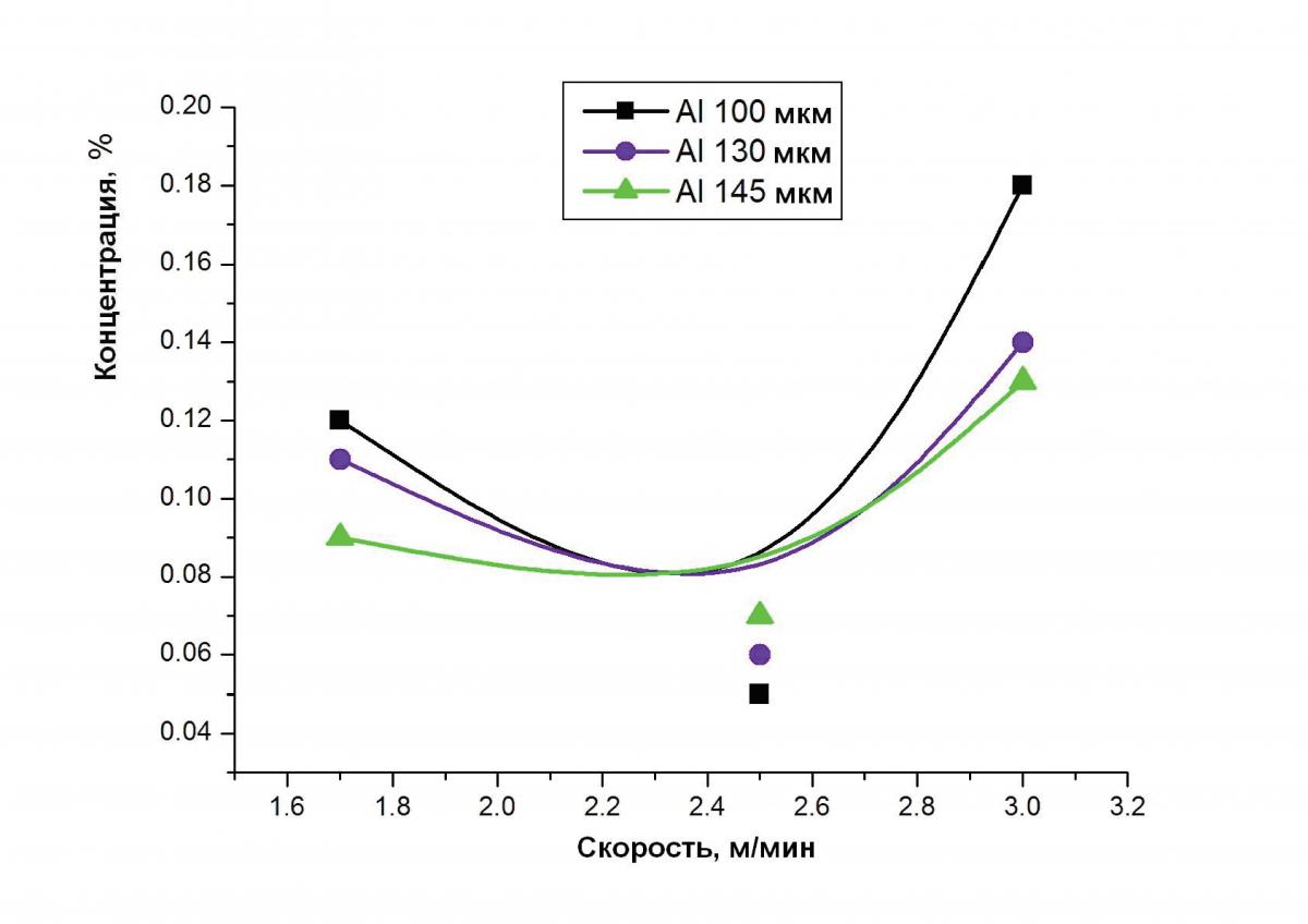 Рис. 5. Распределение концентрации алюминия в приповерхностном слое шва в центральной части от скорости перемещения луча лазера.