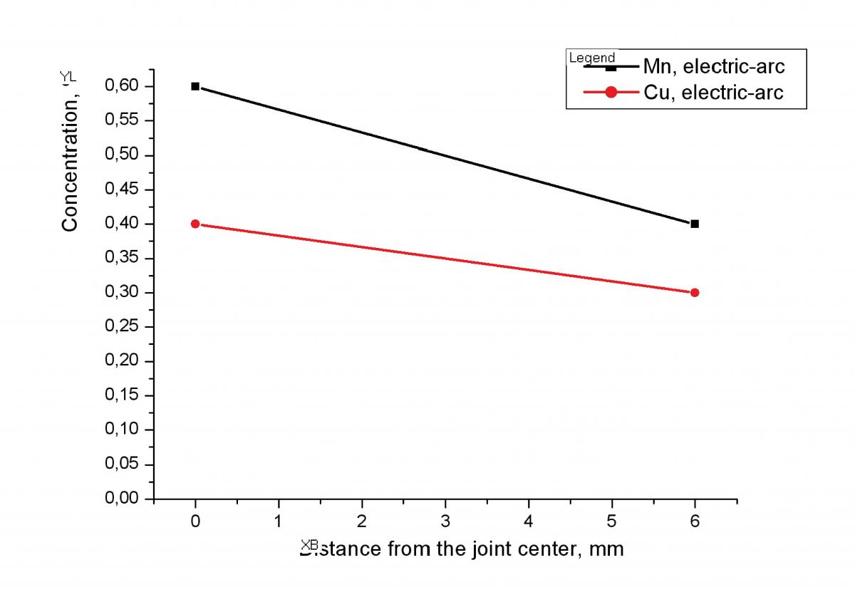 Рассмотренное распределение позволяет сделать вывод, что в ацетиленовых швах, несмотря на признанное более высокое качество сварки и высокую скорость, центральная часть шва более уязвима для внешних воздействий, таких как ударные нагрузки и переменные температуры за счёт обеднения марганцем.