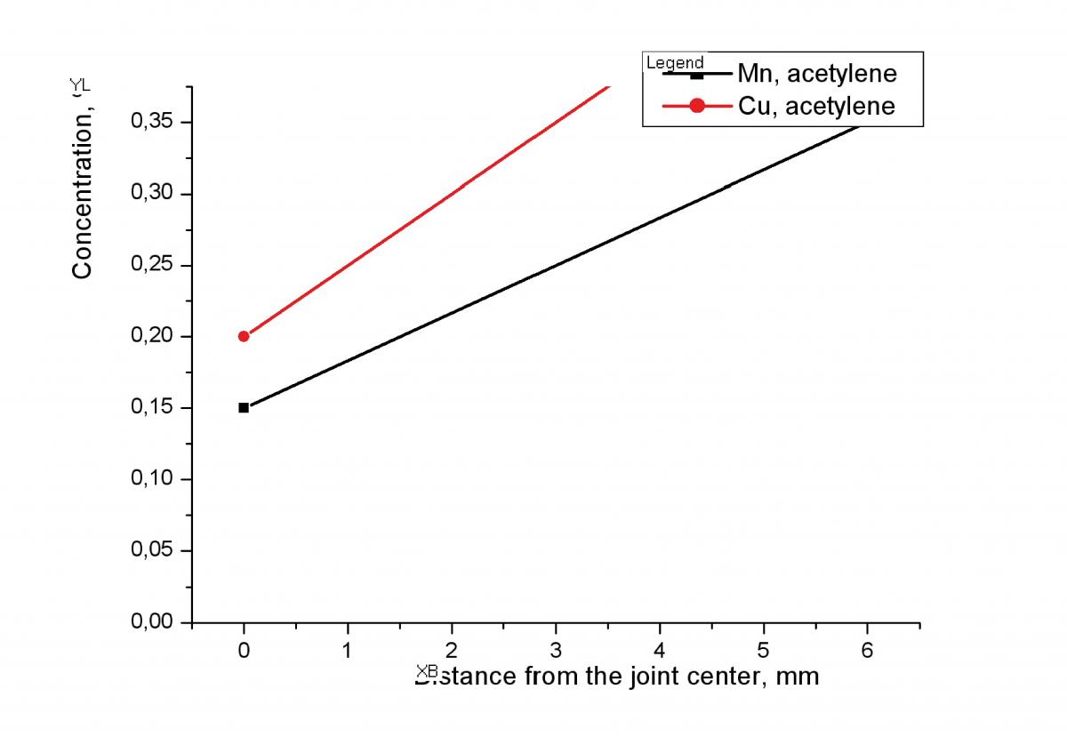 В случае безацетиленовой газовой сварки наблюдается обогащение центральной зоны шва относительно границы. Это распределение аналогично рассмотренному на первом этапе для лазерной сварки однородной стали. По меди наблюдается обогащение во всём шве; по марганцу только центральной зоне — на границе шва содержание марганца выравнивается с исходным. Граница «жидкая фаза — твёрдый материал» обеднена примесями, как и в случае лазерной сварки.