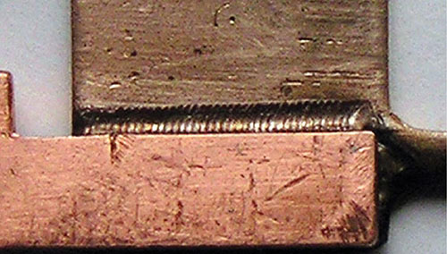 Исследование сварных швов разных металлов проведено на примере шунтов медь-манганин (рис. 8). Толщина свариваемых кромок 1,5 мм.