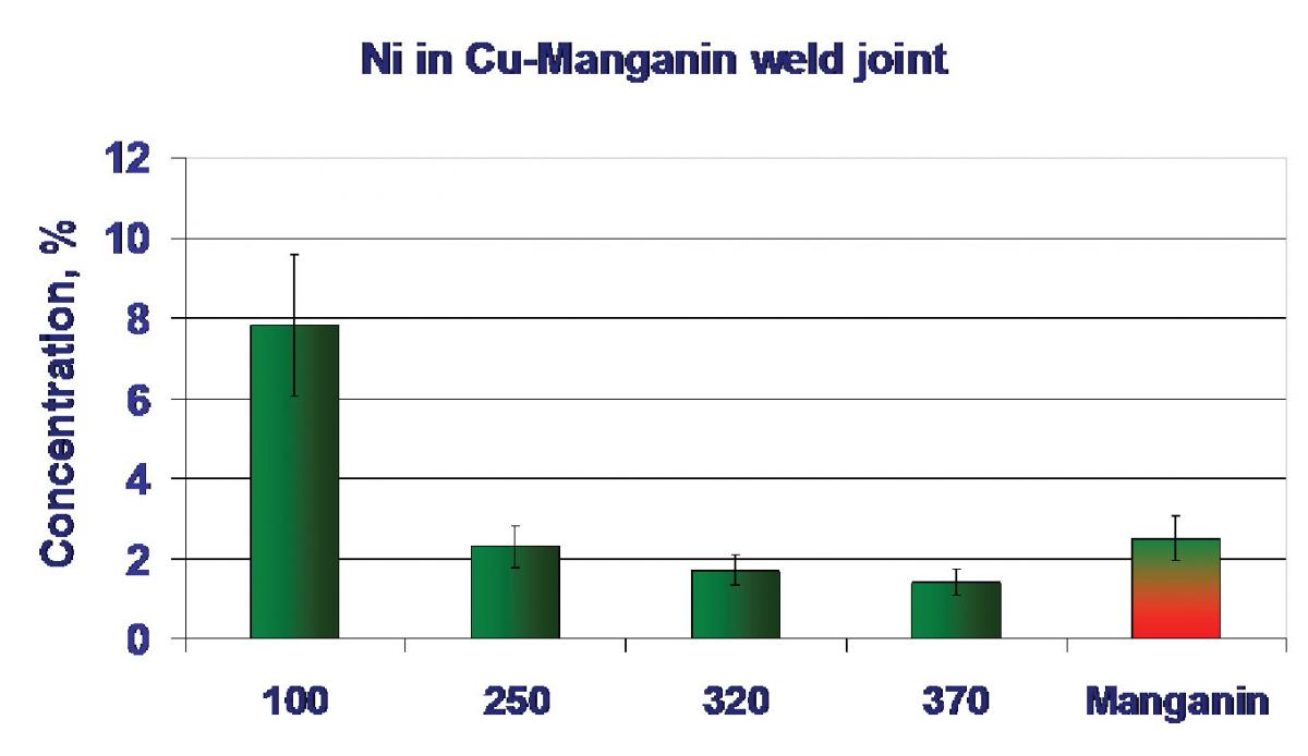 До рассмотрения реальных швов мы предполагали, что содержание легирующих Mn и Ni в шве должно составлять величину, промежуточную между их содержанием в манганине и в меди. Поскольку содержание этих элементов в меди пренебрежимо мало по сравнению с манганином предполагаемая концентрация Ni~1,5%, Mn~6%. На практике зависимость получилась иной.