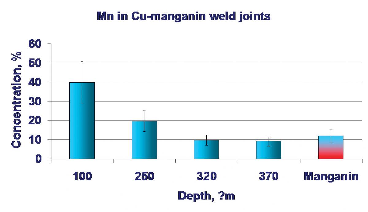 Лазерная сварка проведена импульсным Nd: YAG-лазером, длина вол-ны 1,06 мкм, мощность 200 Вт. Изменения отслеживались по содержанию марганца и никеля в шве в глубину, поскольку для электрических шунтов более важным является изменение объёмных свойств, особенно электропроводности. Пробоотбор проводился четырьмя последовательными заглублениями на 100, 250, 320, 370 мкм в центральной зоне шва.