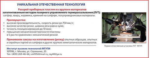 В России впервые в мире разработана и запатентована технология прецизионной резки сапфировых пластин на кристаллы для СИД, а также приборных пластин из других хрупких неметаллических материалов: кварц, керамика, кремний на сапфире, полупроводниковые материалы. Разработана и изготовлена установка для высокоэффективной резки перечисленных материалов. Институт высоких технологий Московского государственного университета приборостроения и информатики принимает заказы на изготовление опытных образцов, опытных и серийных партий изделий из сапфира и других хрупких неметаллических материалов.