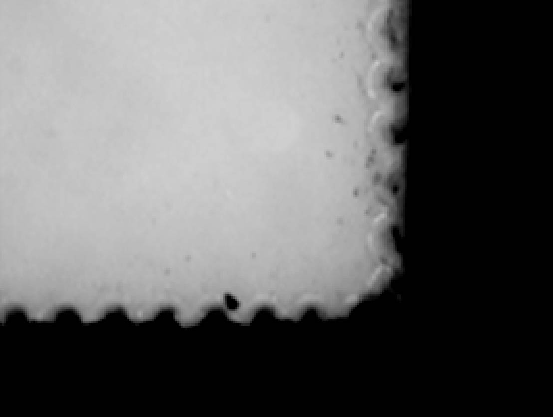 На рис. 2 показан вид кромок и торцов высокочастотного транзистора после резки в первом и втором направлениях. Несмотря на несение надреза во втором направлении с помощью алмазного резца, происходит отклонение линии реза от прямолинейной траектории перемещения. Кроме того, качество торца кристалла во втором направлении резки существенно хуже качества резки в первом направлении. Еще одним недостатком такого способа резки является быстрый износ алмазного инструмента.
