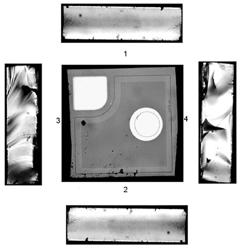 Рис. 2. Кристалл светодиода после резки методом ЛУТ: стороны 1, 2 — после резки в первом направлении; стороны 3, 4 — после резки во втором направлении и торцов кристалла СИД после резки в первом и втором направлении