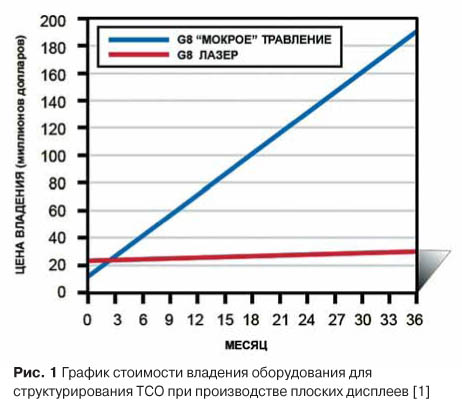 Это было показано при замене «мокрого» травления и фотолитографии в процессе производства плоских дисплеев на лазерную технологию. Лазер был использован вместо традиционных технологий микроэлектроники при выполнении одной из важнейших операций в производстве плазменных панелей, жидкокристаллических и OLED дисплеев, а именно структурировании тонких пленок TCO (прозрачных проводящих оксидов металлов), которые используются в качестве передних контактов. Внедрение лазерных технологий позволило снизить издержки производителей на сотни миллионов долларов и привело к снижению цены мониторов среднего формата на 3040 долларов. При этом качество обработки лазером (прежде всего однородность и селективность в удалении нанослоя ТСО при минимальном повреждении субстрата) оказалась выше, чем при обычной технологии [1].
