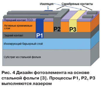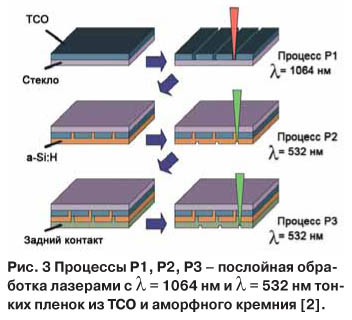 Например (рис. 3), на стеклянный субстрат методом магнетронного напыления наносится TCO, на котором лазером с длинной волны 1,06 мкм создается контактная структура (процесс Р1), затем поверх структурированного слоя ТСО методом плазмостимулированного химического вакуумного осаждения (PECVDпроцесс) наносится слой аморфного кремния, который затем структурируется лазером с длиной волны 0,53 мкм (процесс Р2), затем поверх слоя аморфного кремния наносится металлизованный задний контакт, который также структурируется лазером (процесс Р3).