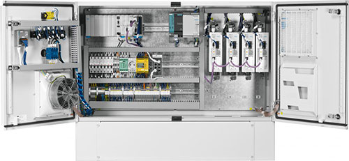Для управления движением портальной координатной системы (3-4 серводвигателя) возможно использовать стандартизованный шкаф управления CMCA (рис. 5). Данный шкаф включает в себя: соответствующий задаче контроллер движения с функциями CNC управления (CPX-CEC-M1 – для задач среднего быстродействия, CECX-X-M1 – для задач высокого быстродействия), необходимый комплект контроллеров двигателей (сервоусилителей) CMMP-AS, а также необходимый набор электроустановочных изделий, блоки питания, системы безопасности и т.д.