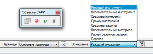Технологический процесс может состоять из множества объектов различного типа и назначения. Однако имеются объекты, которые так или иначе присутствуют в ТП и наличие их обязательно. К ним можно отнести операции, переходы, оснастку и инструмент. Чтобы уменьшить время «блужданий» по множеству контекстных меню в поисках нужного объекта, в системе была создана панель специального технологического назначения. Причем не важно, на каком этапе проектирования ТП находится технолог, он всегда может быстро создать объект, будь то операция, или переход, или инструмент.