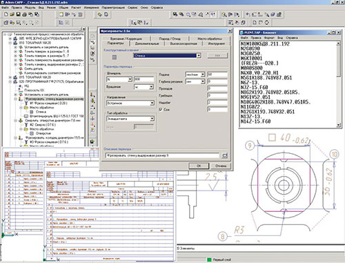 В последнее время для изготовления деталей все больше используется оборудование с ЧПУ. Как правило, технолог-программист, используя программное обеспечение, проектирует маршрут обработки своей части детали, как отдельной операции общего технологического процесса, а затем технолог описывает эту операцию в общем технологическом процессе. Таким образом, получается как минимум два маршрута — один для расчета управляющей программы, другой для формирования комплекта технологической документации. В ADEM CAPP реализовано единое дерево ТП, включающее в себя как операции, выполняемые на универсальном оборудовании, так и операции, выполняемые с использованием станков с ЧПУ. Таким образом, технолог и технолог-программист работают в едином информационном пространстве. Вследствие этого не возникает двух различных маршрутов при описании обработки на станке с ЧПУ. Вся информация из ТП (операции, в том числе операции с ЧПУ, переходы, оснастка, режимы резания, нормы времени и др.) автоматически попадают в формируемые маршрутные, операционные карты, ведомости оснастки, карты наладки и другие. Следует отметить, что в маршрут обработки на оборудовании с ЧПУ можно добавлять дополнительную информацию, не используемую при расчете управляющей программы, но необходимую для оформления выходных документов. Это могут быть установочные переходы, переходы технического контроля, технические требования, примечания, приспособления и т. д. Для эффективной работы технолога и технолога-программиста используется единая информационная база данных по операциям, оборудованию, оснастке, материалам.