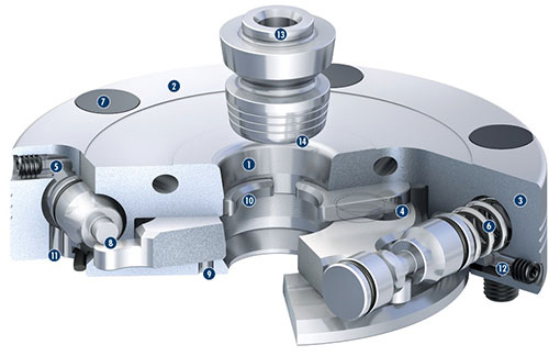 Позиционирование зажимающего штифта 13 осуществляется посредством короткого конуса 1, а его фиксация – посредством трех зажимающих ползунов 10. Самостопорящееся запирание осуществляется усилием пружины 6 и геометрическим замыканием поверхностей 4. Большая контактная поверхность между зажимающим ползуном и штифтом позволяет снизить до минимума давление, оказываемое на штифт в зажатом состоянии, а также уменьшить износ модуля. Диаметр модуля составляет 90 мм, а диаметр зажимающего штифта – всего 20 мм. При этом, благодаря функции "турбо" модуль развивает чрезвычайно большое втягивающее усилие – до 1500 Н.