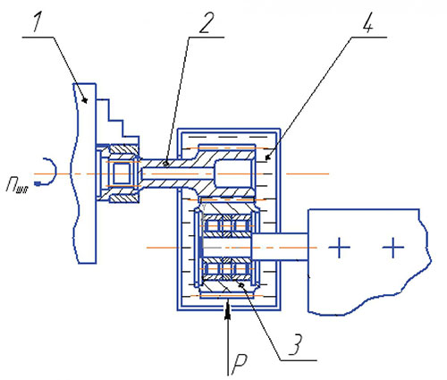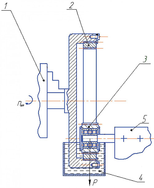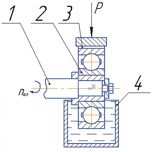 Рис. 1. Схема обкатки подшипников качения на машине трения МИ-1 М: 1 — шпиндель вращения; 2 — подшипник; 3 — схема нагружения; 4 — ванна.