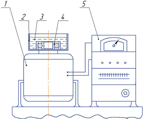 Рис. 3. Установка для диффузионного молекулярного армирования: 1 — вибратор электродинамический; 2 — емкость; 3 — рабочая жидкость; 4 — обрабатываемая деталь; 5 — блок питания вибратора; 6 — термошкаф.