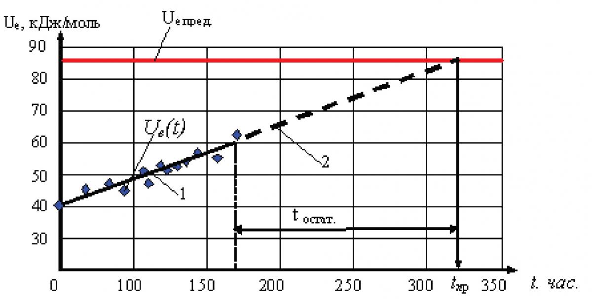 1 — участок графика накопления повреждаемости, построенный по экспериментальным данным; 2 — экстраполяция экспериментальных данных до пересечения с линией предельной повреждаемости — Ue пред; tпр — время исчерпания остаточного ресурса; tостат — остаточный ресурс.