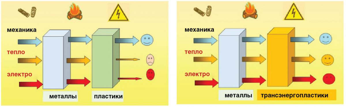 К сожалению, в ряде технических приложений (в первую очередь там, где требуется способность конструкционного элемента эффективно проводить тепловую и электрическую энергию) внедрение пластмасс взамен металлов до последнего времени не представлялось возможным. Причина кроется в принципиальном различии их способности (рис. 1) передавать (транспортировать) через себя тепло и электричество. А это два из трёх наиболее широко распространённых в природе фундаментальных видов энергии.