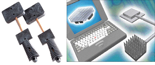 Теплорассеивающие пластмассы являются реальной альтернативой алюминию, нержавеющей стали и меди при конструировании и изготовлении испарителей и конденсаторов тепловых труб, в т. ч. и контурных. Их известные преимущества: низкая плотность, высокая точность и низкая себестоимость сложнейших 3D деталей из них позволяют изготавливать легкие, недорогие и высокоэффективные тепловые трубы. Примеры применения теплорассеивающих пластмасс в тепловых трубах для охлаждения электронных компонентов показаны на рис. 11.