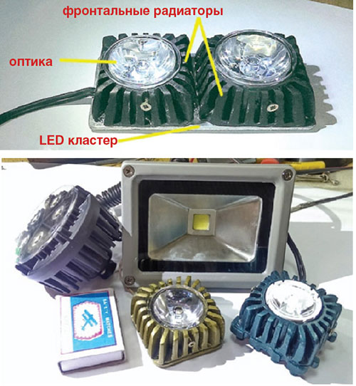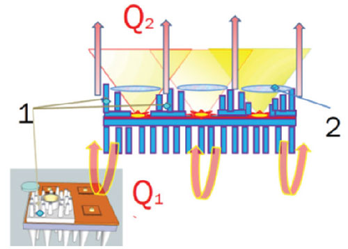 Рис. 13. Схема комбинированного (традиционный тыловой + фронтальный) отвода тепла при работе высокомощных LED кластеров.