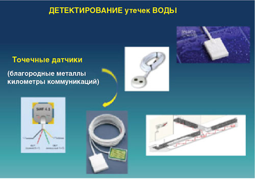 Центральными элементами таких систем являются датчики. Подавляющее большинство из них — это точечные датчики (рис. 7). Они снимают соответствующую информацию (факт замыкания водой двух контактов) вблизи от своего местоположения. Это означает, что для эффективного контроля на протяженных технических объектах (например, в городской системе горячего водоснабжения) необходимо установить большое количество датчиков. И каждый датчик должен иметь свою линию коммутации с интерфейсами оповещения.