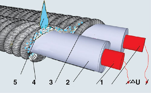 Поступающая вода 5 благодаря гидрокапиллярному эффекту внутри изолирующего жгута 4 замыкает электропроводящие полимерные оболочки 2 параллельно проложенных сенсорных жил 1. В результате этого возникший сигнал отображается на контрольном интерфейсе системы. Обработка параметров возникшего за счет этого сигнала U1 позволяет точно вычислить (локализовать) конкретное место попадания воды на кабель.