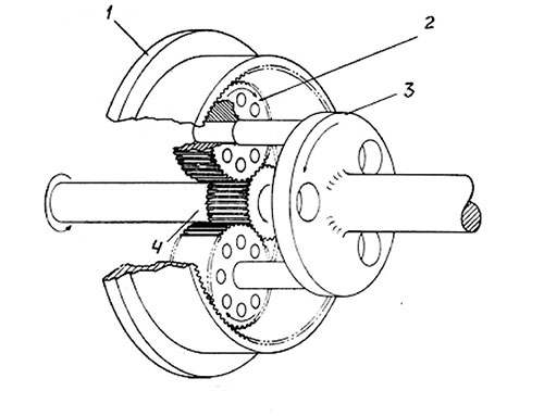 В автомобильной технике наибольшее применение нашли однорядные планетарные передачи, состоящие из ведущей солнечной шестерни 4, неподвижного коронного колеса 1, а также трёх, пяти и реже семи сателлитов 2. Замыкающим звеном является водило 3, которое передаёт вращение с числом оборотов, уменьшенным в 3 и более раз, по сравнению поступающим на солнечную шестерню (рис. 1). В планетарной передаче должны быть точно сбалансированы зацепления зубьев как солнечной шестерни с сателлитами, так и сателлитов с неподвижным коронным колесом. Для нормального функционирования планетарной передачи очень важно, чтобы число сателлитов в передаче было кратно сумме зубьев неподвижного коронного колеса и ведущей солнечной шестерни.