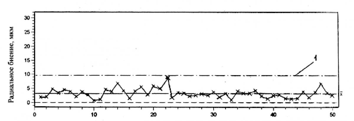 Среднее арифметическое отклонение радиального биения равнялось x = 3,198 мкм, а максимальное значение радиального биения 1 не превышало 9,6 мкм (3 степень точности по ГОСТ 1643—81) при допуске 32 мкм (6 степень точности).