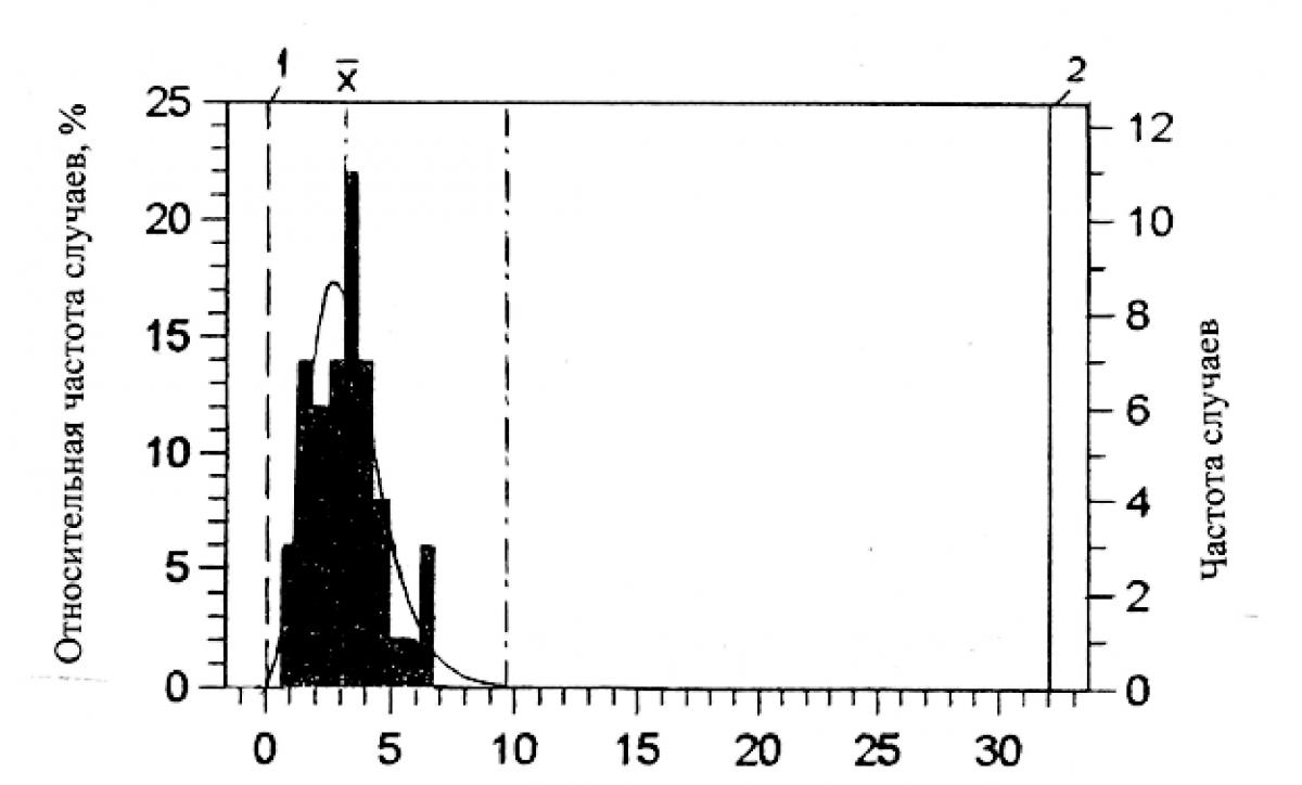 Рис. 11. Схема статистического контроля радиального биения зубчатого венца: 1 – нижнее допустимое значение; 2 – верхнее допустимое значение.