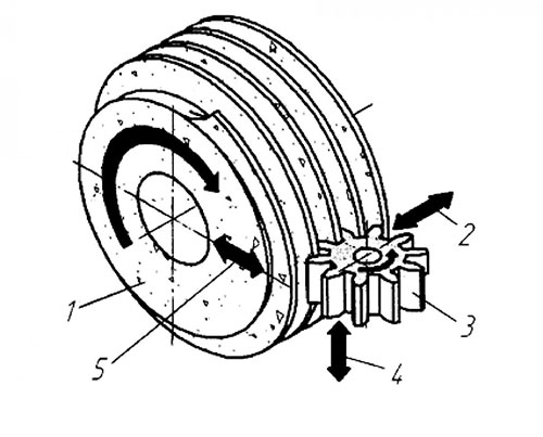 В работе зубошлифование производили червячным шлифовальным кругом 1, исходный контур, которого имеет форму зубчатой рейки (рис. 3). Эвольвентный профиль зубьев сателлитов образовывался посредством движения обкатки червячного шлифовального круга 1 и зубчатого колеса 3, находящихся в беззазорном зацеплении. Одновременный контакт на нескольких левых и правых боковых поверхностях зубьев колеса и витков шлифовального круга при их вращении обеспечивал непрерывный съём металла. Благодаря движениям подач: радиальному 5 и осевому 4 шлифование зубьев осуществлялось по всей высоте и длине. Управляемое тангенциальное движение подачи 2 заготовки вдоль оси шлифовального круга позволяло использовать всю его полезную высоту, периодически вводя в работу неизношенные витки круга. Червячный шлифовальный круг был установлен под углом к оси заготовки, который зависит от угла подъёма витка круга и угла наклона обрабатываемого зубчатого колеса.