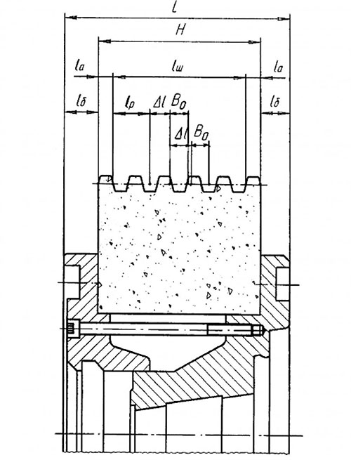где lб — длина буртика планшайбы; lа — длина неполного витка; H — высота круга; lш — рабочая длина круга, т. е. длина круга, используемая при зубошлифовании.