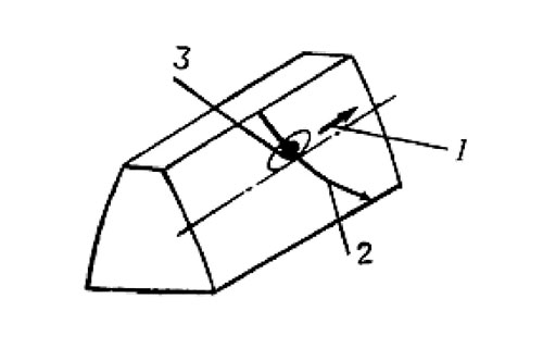 Зёрна плавленных электрокорундов 1 (рис. 8, а) и спечённых микрокристаллических корундов 4 (рис. 8, б) имеют геометрическую форму неправильного многоугольника. Поэтому вершины зёрен образуют отрицательные передние углы, при которых силы резания и температура в зоне обработки значительно выше, чем при положительных углах.