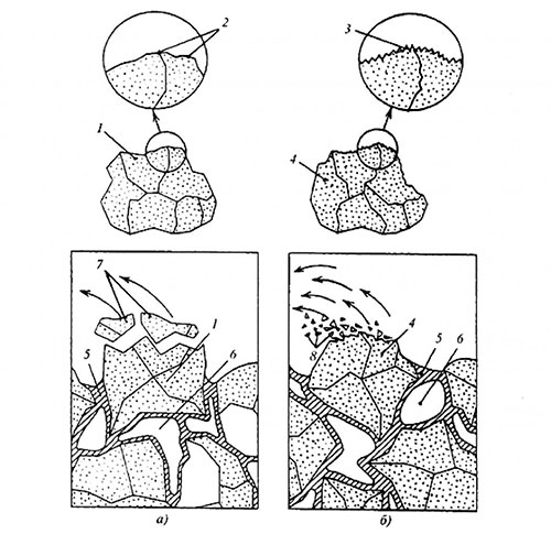 Плавленный электрокорунд 1 при затуплении в результате трения сначала округляется с образованием площадок 2 износа, а затем возросшая сила резания разрушает зёрна с отделением сравнительно крупных частиц 7. Режущие свойства электрокорундов резко снижаются и требуется профильная правка.