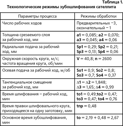 Параметры режимов зубошлифования сателлита планетарной передачи приведены в табл. 1. Максимальный припуск на сторону зуба составлял 0,22 мм. В целях снижения отрицательного воздействия технологической наследственности на точность шлифованных зубчатых колёс колебание длины общей нормали не превышало 0,028 мм (точность 9—10 степень по ГОСТ 1643—81).
