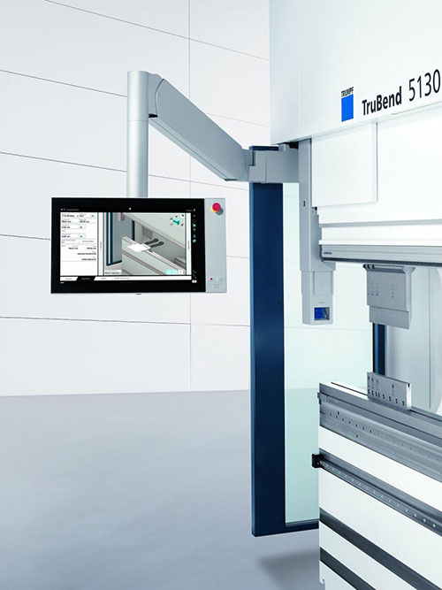 Интересной новинкой от TRUMPF стала «умная обувь». Рабочая обувь с умной сенсорикой — это новый революционный элемент управления для гибочного пресса TruBend Serie 5000. С MagicShoe оператор может легко безопасно и свободно приводить ступицу в действие в любом положении машины. Также новая система управления Touchpoint TruBend относится к гаджетам, делающим управление рабочими процессами простым и интуитивно понятным. Машина управляется с помощью 21,5-дюймового монитора, представляющего собой мультисенсорный планшет, который не требует компьютерной мыши и даже позволяет работать в перчатках.
