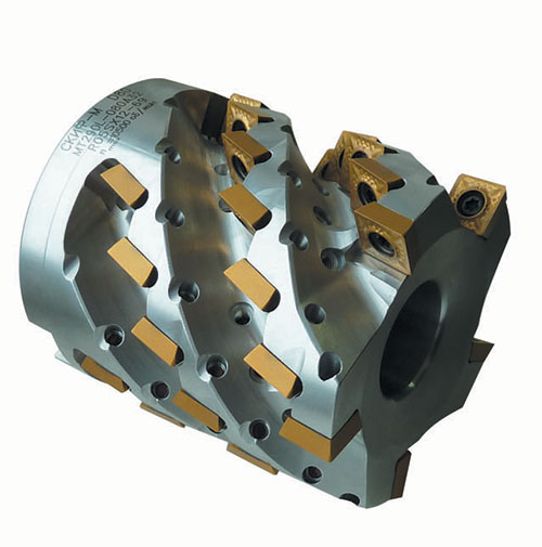 Новые торцово-цилиндрические фрезы (рис.1), оснащенные режущими пластинами увеличенной прочности со специальной геометрией передней поверхности, обеспечивают наряду с высокой производительностью высокую надежность процесса черновой обработки, что особенно важно при обработке сложных деталей на современных обрабатывающих центрах. Для фрезерования деталей аэрокосмического назначения из титановых сплавов фрезы оснащаются специальными соплами подачи охлаждающей жидкости в зону резания под давлением. Выпускаются в насадном исполнении диаметром от 63 до 125 мм и в виде концевых фрез с метрическими хвостовиками №50, а также с хвостовиками HSK100A и HSK125A диаметром от 50 до 80 мм с длиной режущей части до 147 мм. Особенностью всех фрез концевого исполнения является применение в конструкции сменной торцовой части, значительно повышающей эффективность эксплуатации фрез. Специальное покрытие корпусов наряду с особым исполнением стружечных канавок у фрез с крупным шагом позволяет достичь революционной производительности при фрезеровании пазов большой глубины за один проход.