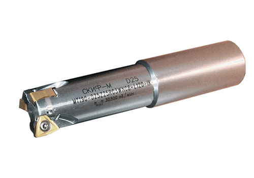 Для съема небольших припусков освоен выпуск высокоэкономичных фрез, оснащенных двухсторонними трехгранными пластинами, имеющими 6 эффективных режущих кромок. Фрезы (рис. 2) обеспечивают получение уступов 90° во всем диапазоне диаметров. Выпускаются с двумя типоразмерами пластин для глубин резания до 3,5 мм и до 5 мм: торцовые фрезы с нормальным и мелким шагом диаметром от 40 до 100 мм и концевые фрезы диаметром от 20 до 40 мм. Особо эффективны при обработке легированной стали различного назначения.