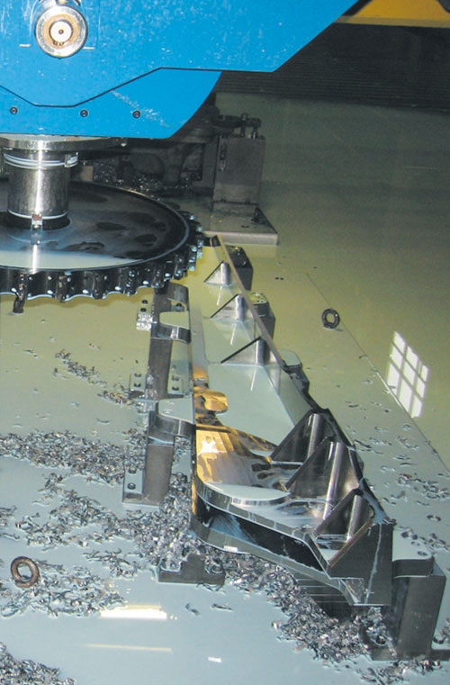 Рис. 4. Обработка глубокого паза несущей детали современного самолета из высокопрочного титанового сплава дисковой кассетной фрезой СКИФ-М диаметром 550 мм