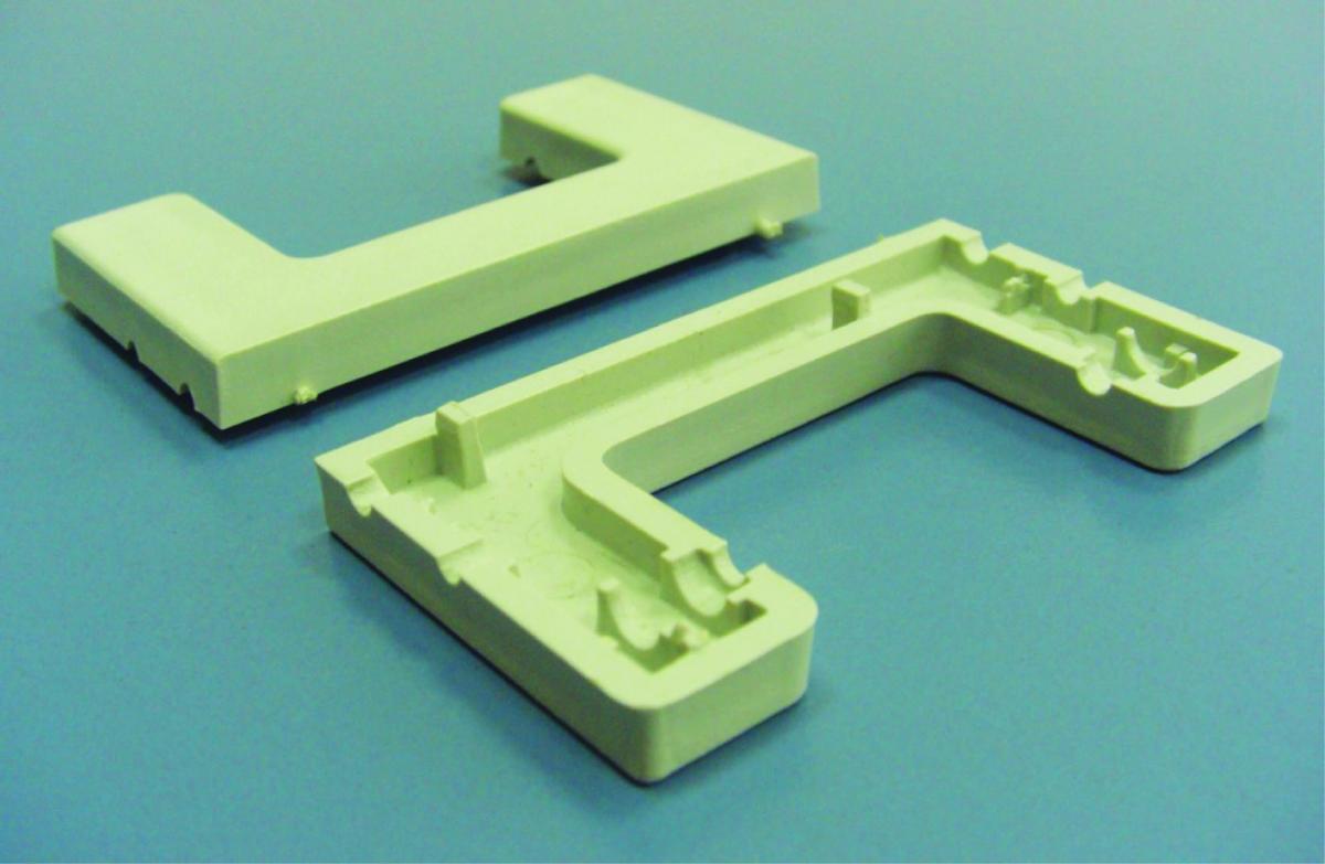 Полученные заготовки обрабатывались с помощью традиционных методов механообработки (фрезеровка, шлифовка, полировка). Изготовленные формообразующие (рис. 2) были установлены в универсальный блок пресс-формы и отлита партия деталей (рис. 3) в количестве 10000 шт.