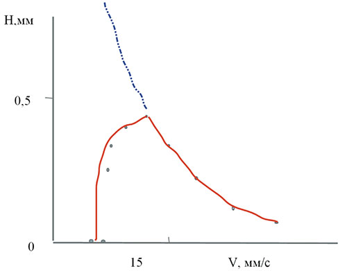 Неожиданный и самый сложный в объяснении эффект наблюдался при лазерной обработке медных сплавов. Впоследствии этот эффект был обнаружен и на сталях. Как известно, чем выше скорость обработки, тем меньше зона оплавления. Эта зависимость наблюдается в большом количестве экспериментальных работ. Однако для медных сплавов, в частности для бронзы, такая зависимость имеет аномалию (рис. 2).