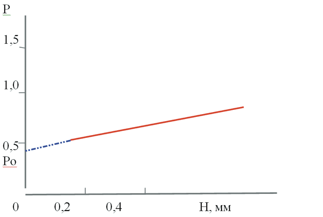 Ряд технологий требует концентрированного по плотности мощности излучения. По сути, в этом случае мы имеем плазменный источник, для поддержания которого расходуется некоторая мощность Ро. Экспериментальная зависимость глубины обработки от мощности излучения представлена на рис. 3. Синяя кривая — аппроксимация при нулевой глубине, определяет мощность образования и поддержания плазменного приповерхностного источника; красная кривая — реальная зависимость глубины от мощности излучения.