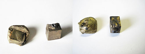 Рис. 5. Оплавленный изолированный и заземленный образцы; температура плавления первого 480 оС, второго 820 оС