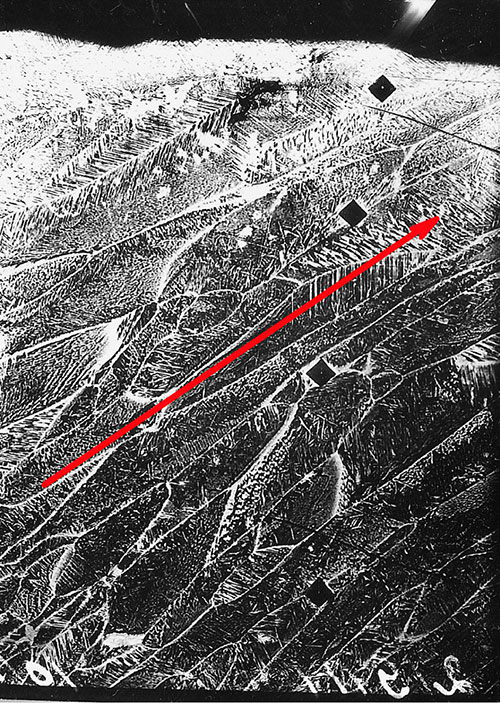 Такое впечатление, что мартенситные иглы «помнят» направление источника лазерного излучения и строго его придерживаются. Объяснения этому явлению найти не удалось. Но направленность игл необходимо учитывать при разработке технологий, т.к. возможно проявление анизотропии в свойствах упрочненного материала.