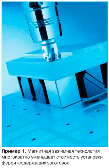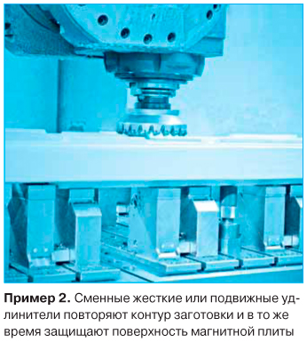 Квадратные плиты уменьшают время установки заготовки до 70%. Во многих случаях дорогая переустановка и последовательное прерывание процесса обработки исключается, поскольку заготовка может быть безопасно обработана с пяти сторон за одну установку. Квадратная магнитная плита MAGNOS производства компании SCHUNK (Германия) с размером полюса 50*50 мм позволяет зажимать заготовку с силой более 100 т/м?. При помощи удлинителей абсолютно безопасно и свободно без всякой деформации могут быть зажаты заготовки сложной геометрической формы. Сменные жесткие или подвижные удлинители помогают обеспечить оптимальный прижим заготовки и уменьшают износ поверхности магнитной плиты.