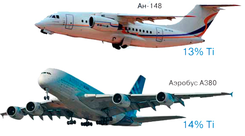 Применение титана в пассажирских самолетах, выпускаемых вплоть до 2004 г., не превышало 6%. В последнее время растет доля титана и в гражданской авиации. Масса самого большого пассажирского самолета в мире Аэробуса А380 – на 14% состоит из титана, а новейшего Боинга В 787 – уже на 18%. Если говорить об отечественных самолетах, то можно отметить, что семейство реактивных пассажирских самолетов Ан148, содержит 13 % титана, а лайнер Sukhoi Superjet 100 – 5%.