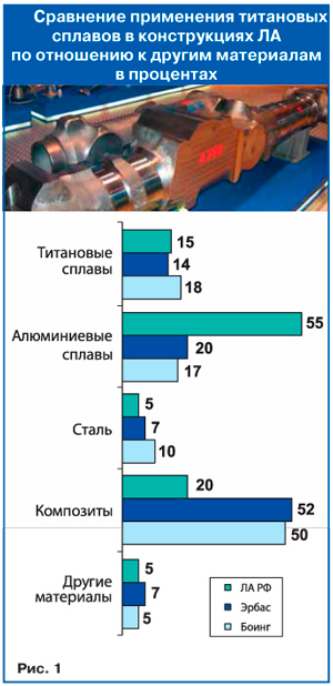 Сегодня половина титана, произведенного в мире, потребляется авиакосмической промышленностью. Причем уже в ближайшее десятилетие ожидается удвоение показателя. Широкое внедрение титана в самолетостроение успешно решает требование снижения веса конструкции. Широкое применение в авиастроительной промышленности композиционных материалов (КМ) (например, углепластиков) требует применения титана, т.к. он намного лучше алюминия соединяется с КМ и на 60% увеличивает жизнь летательных аппаратов. К высокой прочности добавляется и свойство незначительных деформаций при температурных изменениях, что повышает размерную стабильность конструкций.