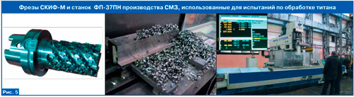 Отечественный производитель режущего инструмента, ООО «СКИФМ» (Белгород), выпускает широкую гамму фрез и пластин, в т.ч. для фрезерования высокопрочных титановых сплавов ВТ22 и ВТ23 отечественного производства и Ti 10.2.3. и Ti 5.5.5.3 зарубежного. Интенсивные испытания, проводимые «СКИФМ» совместно с заказчиками в области повышения производительности чернового фрезерования высокопрочных титановых сплавов, позволили достичь значительных результатов при обработке крупногабаритных поковок. Наилучшие результаты показывают концевые торцовоцилиндрические фрезы, оснащенные пластинами твердого сплава HCS35.