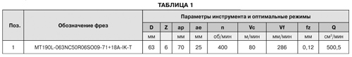 При испытаниях достигнута производительность обработки титанового сплава Q = 500см3/мин (см. рис. 5, таблица 1).