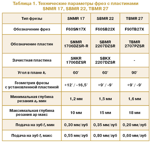 Рекомендуемая величина подачи на зуб fz и глубина фрезерования ap позволяют инструменту с пластинами SNMR 17 работать с большой производительностью резания. А увеличение количества зубьев на данном диаметре по сравнению с фрезами с пластинами SBMR 22 дает возможность применять фрезу на станках, у которых максимальная частота вращения шпинделя ограничена, а также на станках старых типов, позволяя при этом работать с неплохой минутной подачей.