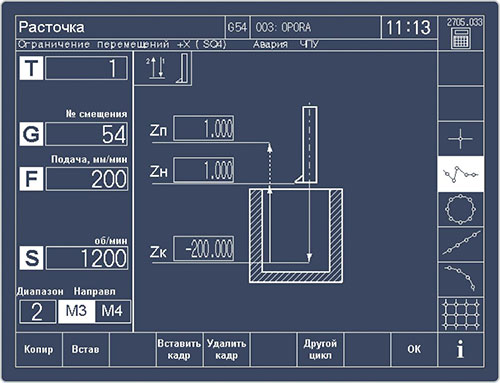 В режиме наладки на панели оператора отображаются значения координат, частоты вращения шпинделя, подачи, нагрузка по осям. Также возможно управление инструментом с помощью маховиков с дискретностью перемещения до тысячных долей миллиметра. Эта функция полезна при изготовлении простых единичных деталей, где не требуется перемещение инструмента по сложной траектории в режиме интерполяции. В случае необходимости перемещения инструмента в заданную точку или на определенное расстояние оператор может воспользоваться подрежимом «Выход в точку» (режим MDI).