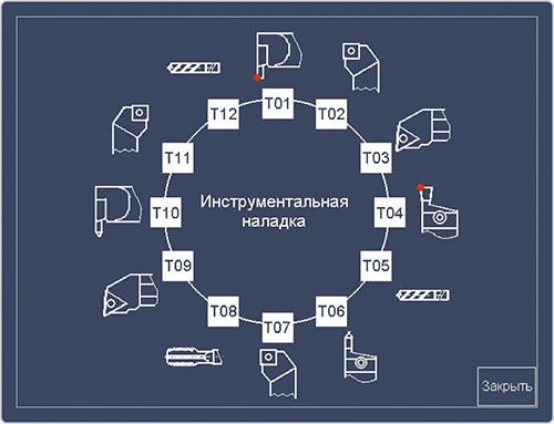 Выбор инструмента осуществляется из отображаемой на экране виртуальной револьверной головки согласно требуемой технологии. Параллельно оператор задает параметры радиуса скругления при вершине режущего инструмента, а также контроля стойкости инструмента. В результате система автоматически учитывает ширину канавочного и отрезного резцов, а также угол резьбы при резьбонарезании.